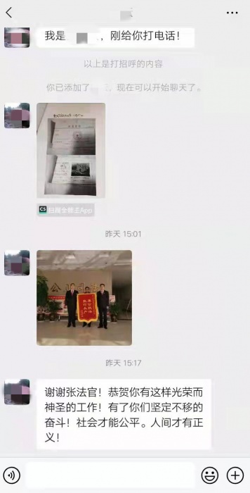 “谢谢张法官!恭贺你有这样光荣而神圣的工作!有了你们坚定不移的奋斗,社会才会公平,人间才有正义!”这是一名民间借贷纠纷案件申请执行人在收到案件执行款后给高新区法院执行局干警发送的消息。